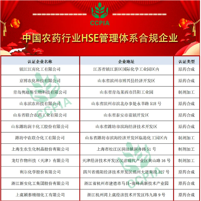 10月11日,“中国农药行业HSE管理体系合规企业”名单发布,华体网页版登录入口旗下子公司青岛奥迪斯生物科技有限公司榜上有名。