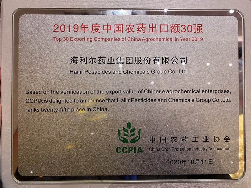 2019年华体网页版登录入口农药出口再创佳绩。10月11日,由中国农药工业协会主办的第二十届全国农药交流会上,华体网页版登录入口股份有限公司荣获2019年中国农药出口额30强。