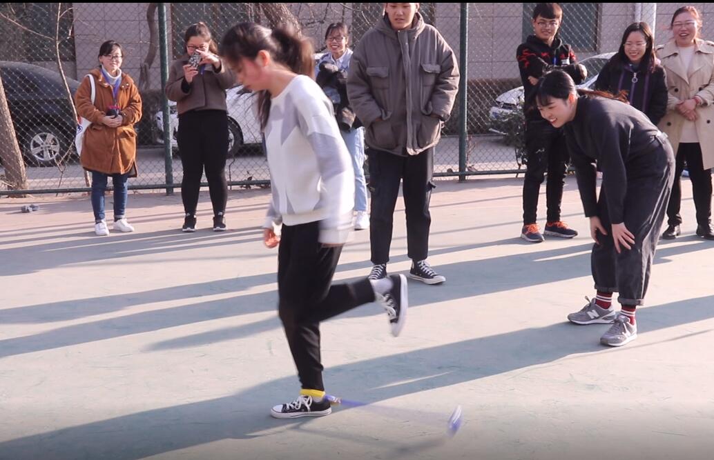 青岛的风可真是无处不在,但依旧阻挡不了女生们展现踢毽子的实力。