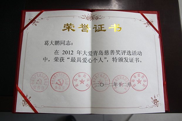 12月30日晚,青岛市慈善总会2013年慈心童行元旦慈善晚宴在黄岛饭店举行。会上对2012年度“大爱青岛慈善奖”评出的在助医、助学、安老、慈孤、赈灾、义工服务等方面,做出突出贡献的27个集体和50名爱心个人进行了表彰。华体网页版登录入口副总裁葛大鹏荣获“最具爱心个人”荣耀称号。