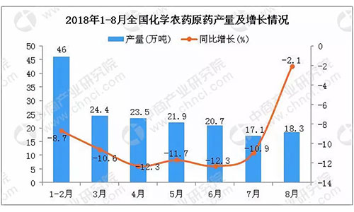 据中商产业研究院数据库显示,2018年3-7月全国化学农药原药产量逐渐下降,2018年7月全国化学农药原药产量为17.1万吨,同比下降10.9%。2018年8月全国化学农药原药产量有小幅度回升,2018年8月全国化学农药原药产量为18.3万吨,同比下降2.1%。2018年1-8月全国化学农药原药产量为147.6万吨,同比下降12.3%。