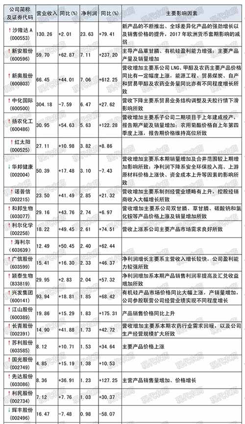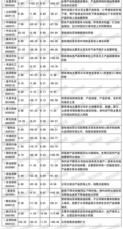 近日,国内农药上市公司纷纷发布了2018年半年度报告,据统计的46份报告中披露的数据来看,上半年,44家盈利,2家亏损,35家公司净利润同比增长,占比76%,且9家公司净利润增幅超100%;净利润超过1亿元的有20家,占比43%,净利润不足0.5亿元的有19家,占比41%。总体而言,上半年国内农药行业需求逐步回暖,产品价格、销量等有所回升,多数企业业绩向好;由于受环保整治、停限产等因素影响,部分企业业绩下滑。 表1 46家农药上市公司2018年上半年营业收入及净利润(亿元)