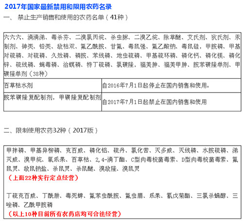 也就是说只有获得定点经营资格的农药经营点才可以销售以上农药,不过根据农业农村部2017年出台的《限制使用农药名录(2017版)》,里面标注的限制使用农药共有32种,其中就包括目前使用量较大的毒死蜱、丁硫克百威、乐果这些产品。