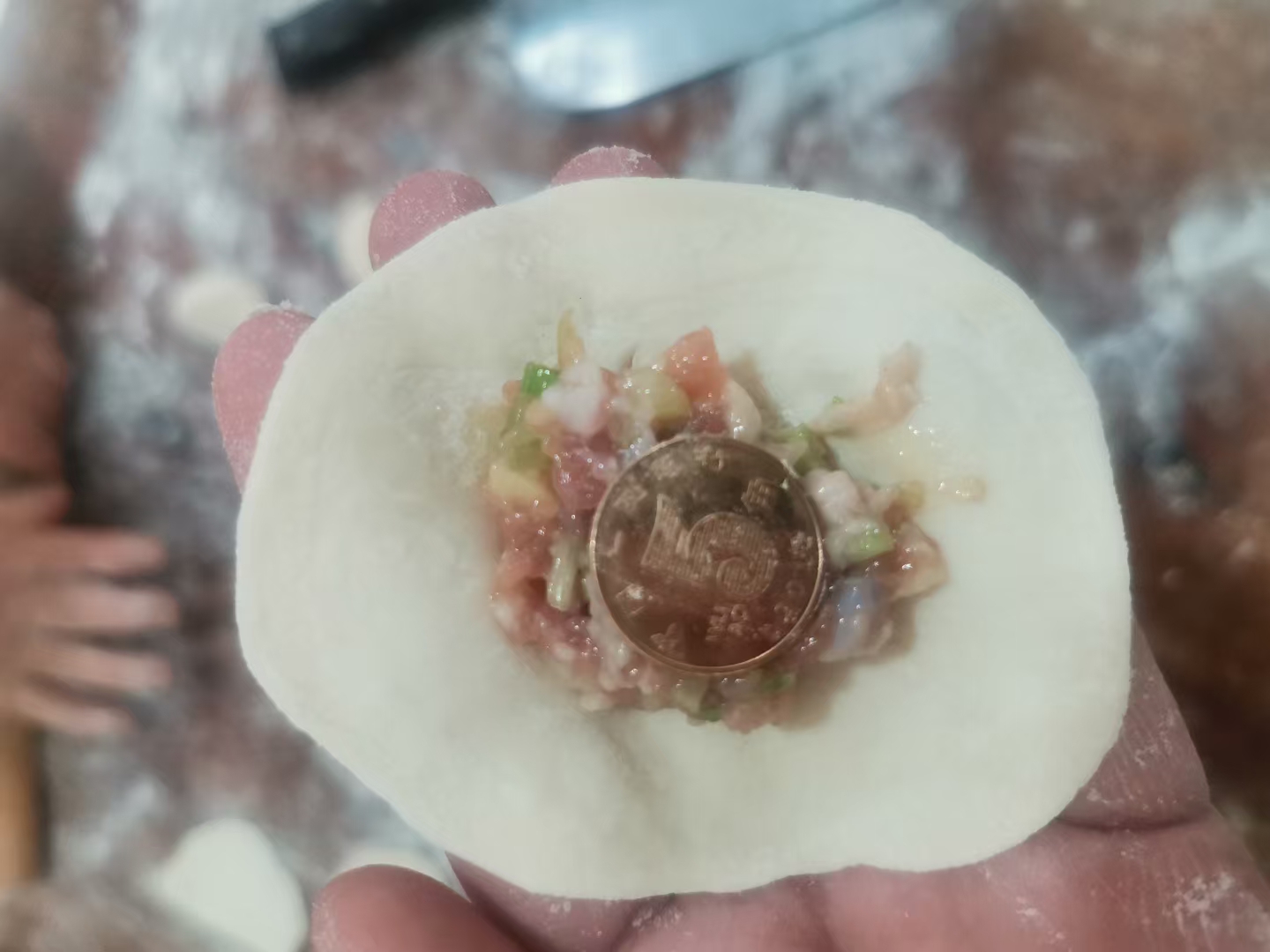 包饺子开始,硬币寓意财源广进,红枣寓意红红火火,糖寓意甜甜蜜蜜,栗子寓意工作顺利!!一擀,二填,三捏皮, 包进了欢喜,品出了甜蜜。