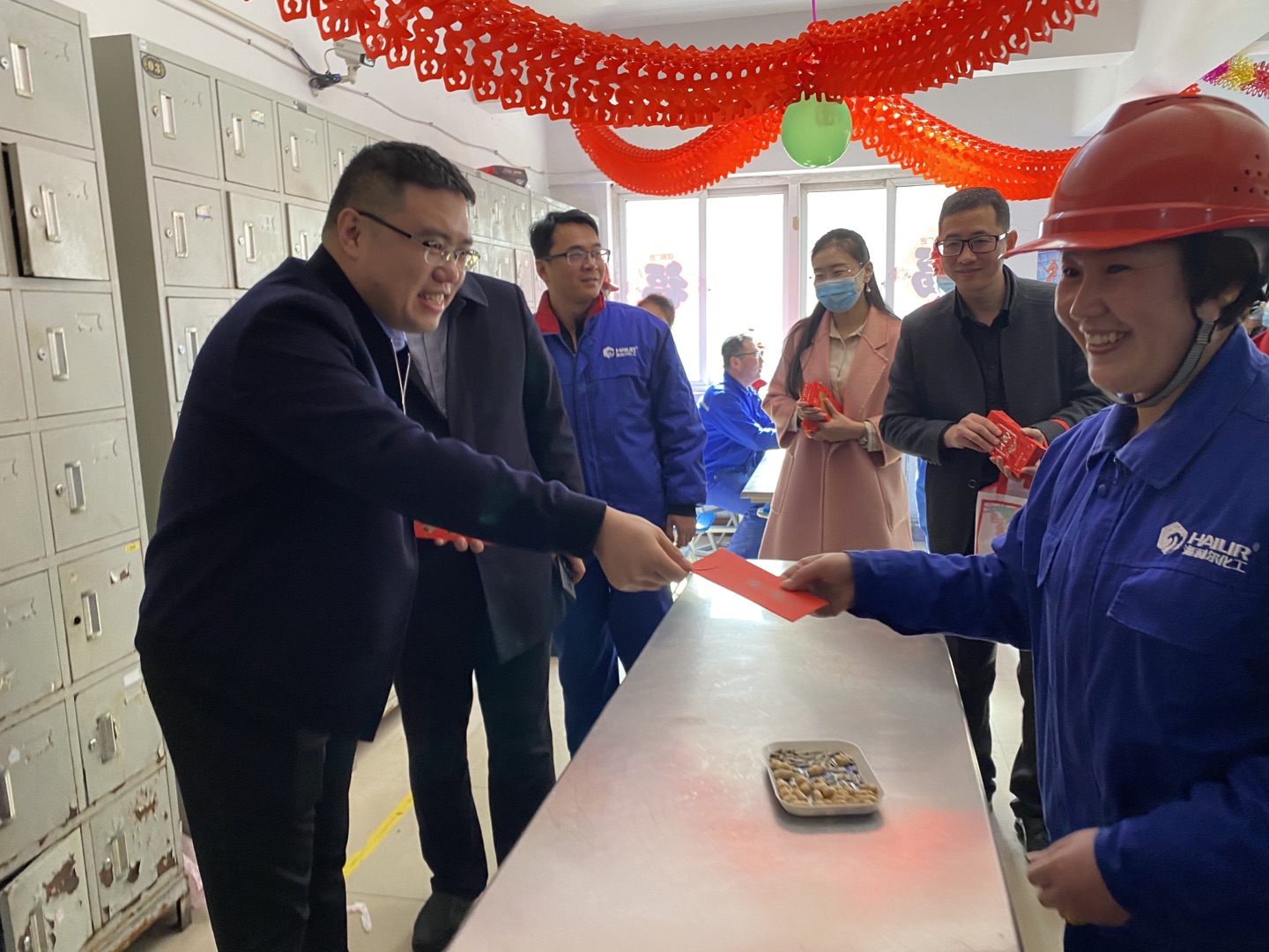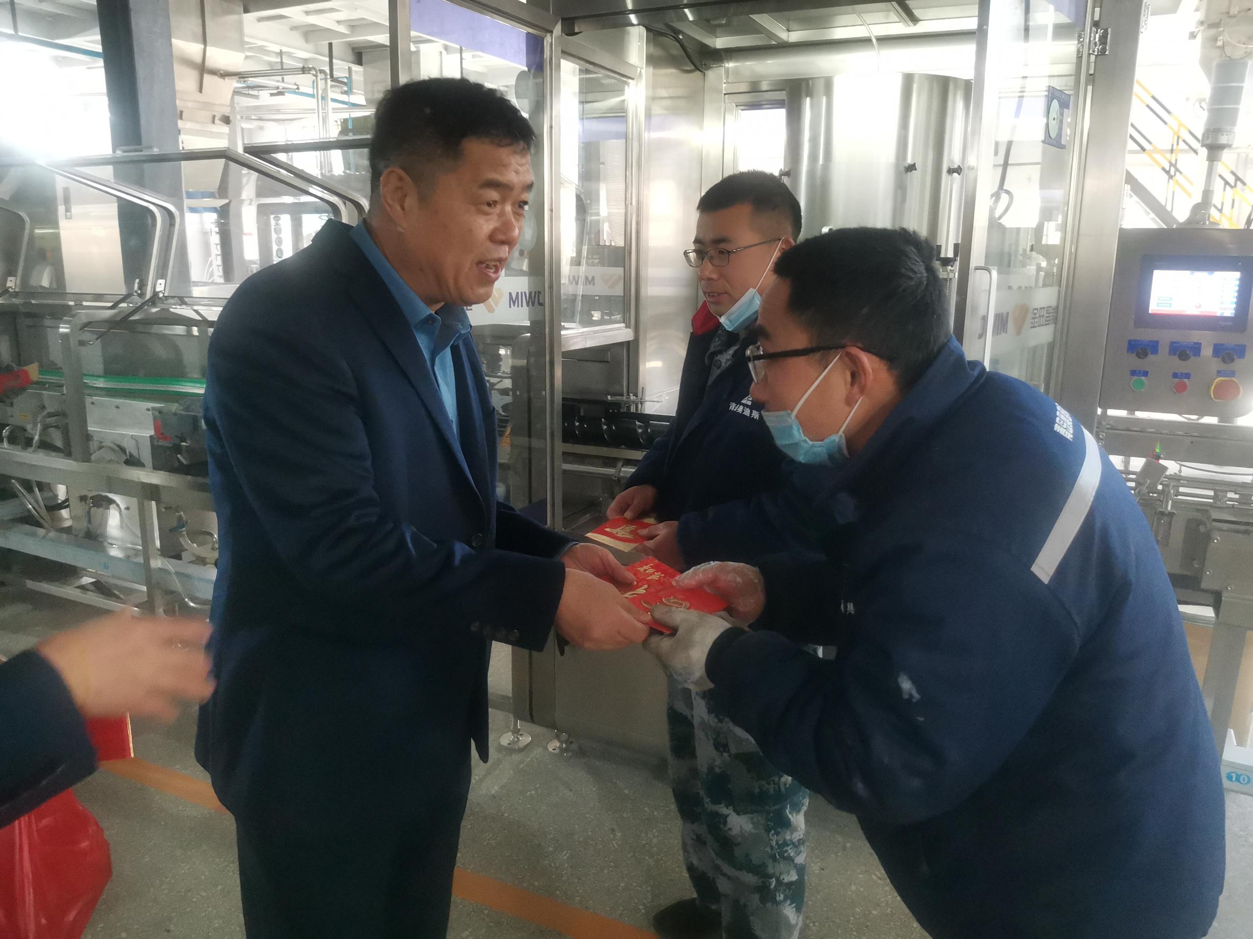 总裁在现场一边给大家拜年送去新年祝福,一边给大家派发新年红包,给所有员工加油助力,现场一片欢声笑语,大家接到总裁的祝福与红包,那份由衷的欣喜与幸福感溢于言表,总裁在现场还了解了过年期间工厂的生产情况及员工生活情况,再三叮嘱工厂在安全生产的同时要确保做好员工各方面的生活保障,让员工度过一个温暖祥和的春节。