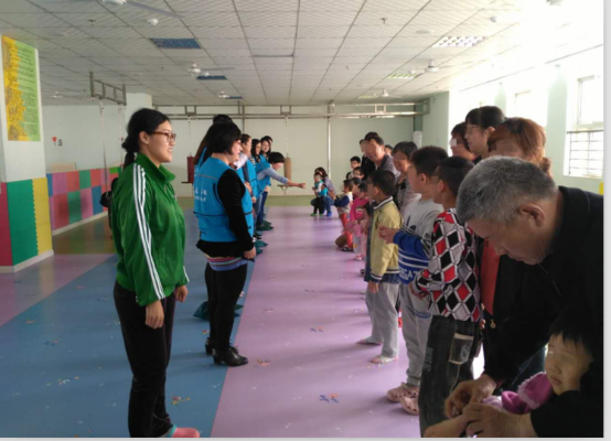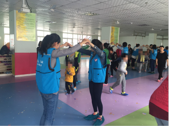 接下来就是“快乐的小火车”游戏,志愿者们主动搭起了“火车轨道”。