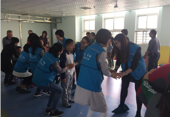 走到二楼活动室,正好赶上他们互动游戏课程,这些孩子对陌生人都有一定的抵触感,所以在老师的引导下,志愿者们通过简单的互动、自我介绍、拥抱等方式建立了初步友谊,小朋友们慢慢的笑起来。